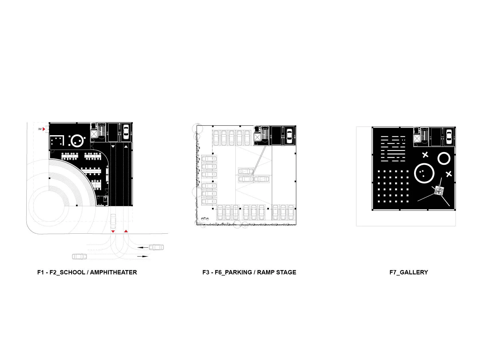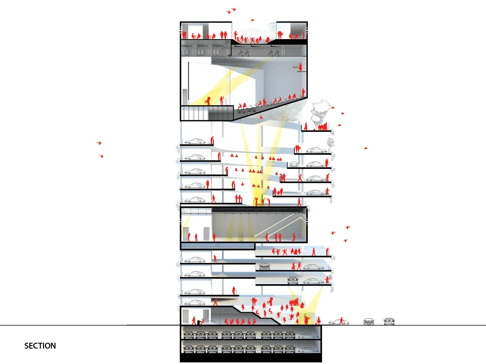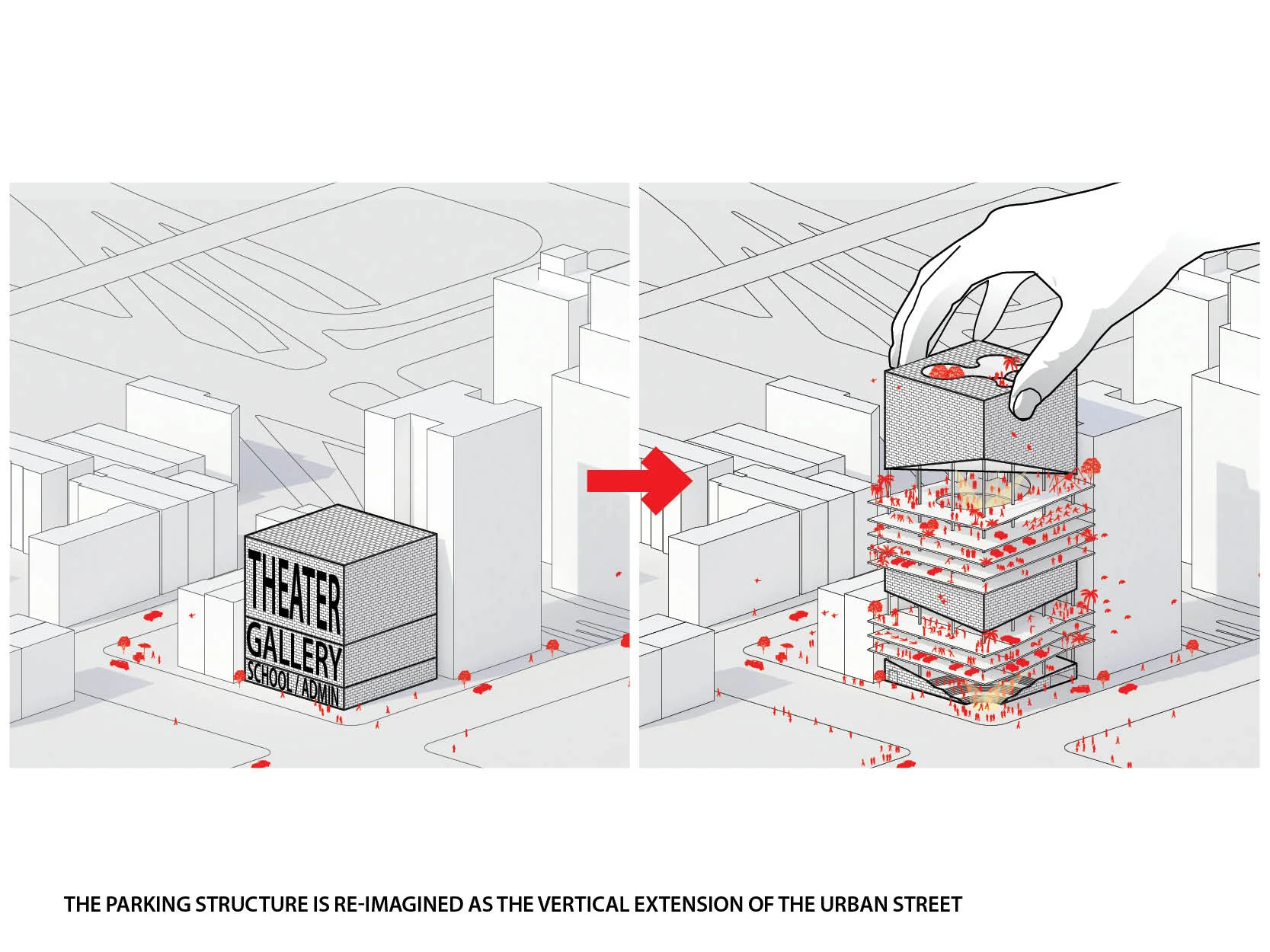 The PARKING LOT PERFORMANCE ARTS CENTER re-imagines what a parking structure can be. Here we have combined it with a performing arts center and a visual arts gallery, so that during the parking off hours the space is open for public use. Our intention was to vertically extend the urban street culture into a Parking